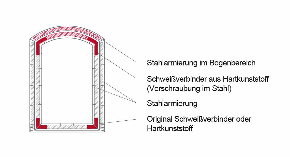 Bei größeren Bogenelementen, bei Haustüren und zweiflügeligen Bogenelementen ist diese Armierung unbedingt erforderlich. Zusätzlich wird von uns die gebogene Armierung mit Schweißverbinder aus Hartkunststoff -welche im Stahl verschraubt wird- zum geraden Teil den Elementes verstärkt.